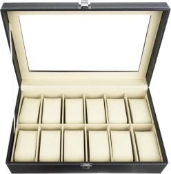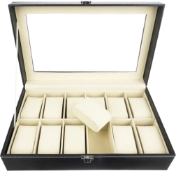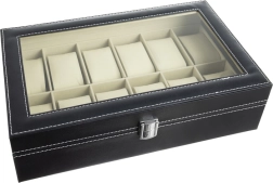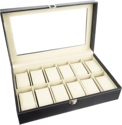 Un élégant organisateur pour montres et bijoux avec 12 compartiments range et met magnifiquement en valeur votre collection. Il possède un couvercle transparent, une finition noire avec surpiqûres contrastées et un rembourrage doux. La fermeture magnétique maintient le contenu en sécurité, les coussins amovibles protègent des rayures et permettent de ranger aussi des bracelets, colliers ou bagues. Un excellent cadeau pour femmes et hommes et un accessoire stylé pour tout intérieur.