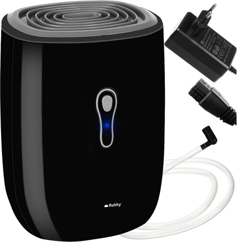Le déshumidificateur d’air compact RUHHY réduit efficacement l’humidité dans la pièce et empêche la formation de moisissures et les mauvaises odeurs. Grâce à la technologie Peltier, il fonctionne extrêmement silencieusement, ne nécessite aucune recharge ni produit chimique et offre une capacité de réservoir de 800 ml avec la possibilité d’évacuation continue de l’eau via un tuyau. Performance quotidienne jusqu’à 300–330 ml, arrêt automatique lorsque le réservoir est plein et faible consommation de 22,5 W en font une solution idéale pour la maison et le bureau.