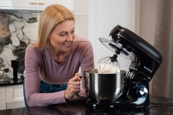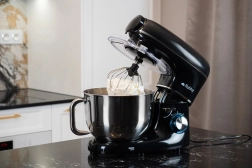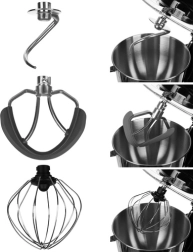 Le coffret comprend trois accessoires : un crochet pétrisseur, un fouet ballon et une pale de mélange avec raclettes en silicone pour une incorporation parfaite des ingrédients. La base stable avec ventouses antidérapantes, le verrou de sécurité et la molette de commande à LED font de ce robot un partenaire fiable pour la pâtisserie et la cuisine au quotidien.