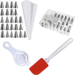 - poche à douille + 24 buses dans un organiseur, séparateur d’œufs, spatule