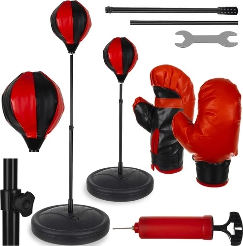 L'emballage comprend également une pompe avec aiguille pour gonfler facilement le ballon de boxe ainsi que les ballons d'autres sports. Le design global de l'ensemble, aux couleurs rouge et noir, offre un look stylé qui séduira tout jeune athlète.