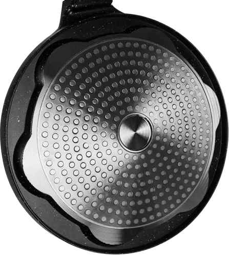 La poêle est en aluminium avec un fond épais pour une meilleure rétention de la chaleur et possède un revêtement antiadhésif PTFE/céramique pour faciliter le retournement et le nettoyage. La poignée ergonomique (amovible) simplifie la manipulation et le rangement. Compatible avec les plaques gaz, électriques, halogènes et à induction.