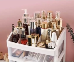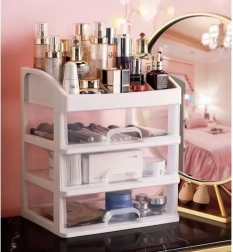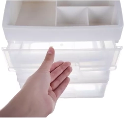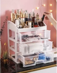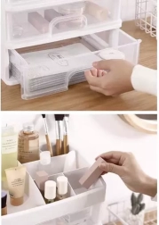 Ce organiseur polyvalent allie classement clair et format compact. Les trois tiroirs transparents de même taille sont idéaux pour les palettes, pinceaux, rouges à lèvres ou bijoux, tandis que le niveau supérieur avec 6 compartiments différents accueille flacons, crèmes et petits accessoires. Son aspect blanc lait/translucide s’intègre élégamment à tout intérieur.