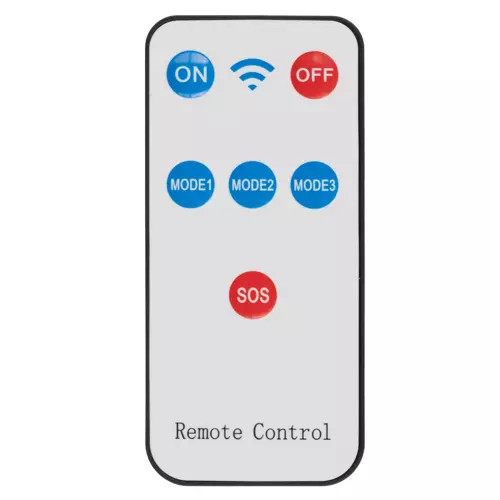 La lampe est équipée d'une télécommande permettant de basculer entre les modes, y compris un mode SOS qui maintient la lampe allumée jusqu'à décharge.