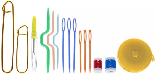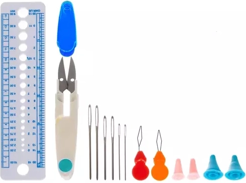 L'ensemble comprend non seulement des crochets, mais aussi des ciseaux, une règle et d'autres outils essentiels pour le crochet.