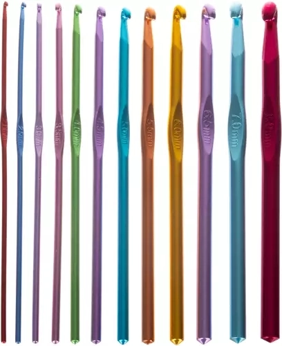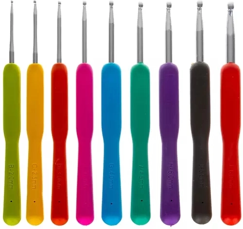 L'ensemble contient 21 crochets colorés de tailles variées avec un design ergonomique pour une utilisation facile et confortable.