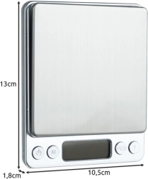 Vous cherchez une mesure précise même pour les plus petites quantités ? Cette balance de cuisine numérique en acier inoxydable avec un corps en plastique offre une précision de 0,01 g et une capacité maximale de 500 g. Grâce à l’écran LCD rétroéclairé bleu, vous lisez facilement les valeurs en toutes circonstances et la fonction TARE vous permet de peser les ingrédients directement dans un bol sans conversions compliquées.