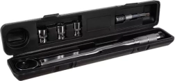 Clé dynamométrique robuste 1/2" avec cliquet, jeu d’embouts 17/19/21 mm et rallonge, pour un serrage et un desserrage précis des assemblages vissés. Plage de couple 28–210 Nm, fonctionnement bidirectionnel droit/gauche, verrouillage LOCK/UNLOCK et étui de protection pratique pour un rangement sécurisé. Idéale pour les vis hexagonales et carrées, les crochets et les écrous de moto.