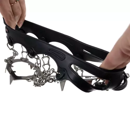 CHAÎNES INOX ET TALON RENFORCÉ – fabriqués en acier inoxydable. Résistants à la rouille et à la corrosion. Il suffit d’étirer le col élastique et de les positionner sur la semelle. Nos cramponsn’abîment pas les chaussures, car ils adhèrent parfaitement, et les renforts de talon assurent la stabilité, surtout en descente.