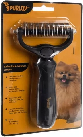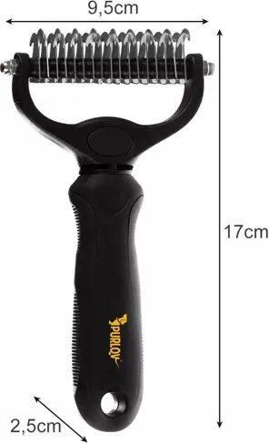 Étrille et râteau double face universels PURLOV pour chiens et chats, combinant une face à 17 dents plus fines et une face à 9 dents plus larges pour le sous-poil dense comme pour les poils fins. Réduit efficacement la mue, démêle facilement les nœuds et le sous-poil et s'utilise confortablement grâce à sa poignée ergonomique antidérapante. Les extrémités arrondies des dents sont douces pour la peau.