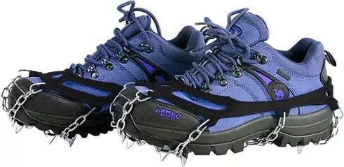 Huit pointes en acier et des chaînettes sur chaque chaussure offrent une accroche fiable lors de la marche sur des surfaces verglacées ou enneigées.