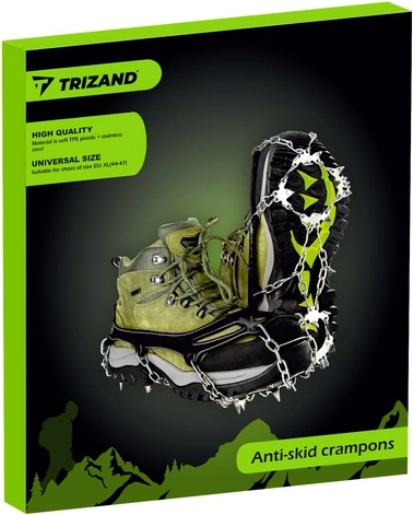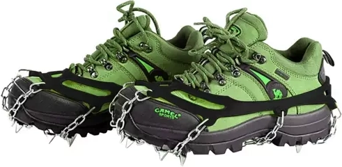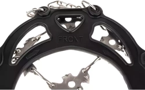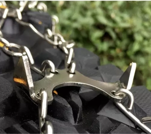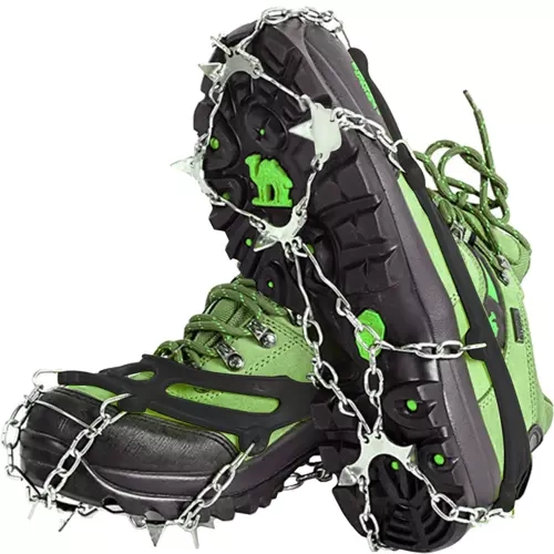 Huit pointes en acier inoxydable sur chaque crampon, complétées par des chaînes, offrent une traction maximale en terrain hivernal et sur le verglas.