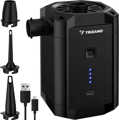 La pompe sans fil Trizand est un assistant utile à chaque voyage. Grâce à ses trois embouts interchangeables, elle peut gonfler les matelas, ballons, pontons et autres objets gonflables. Compacte et facilement transportable, elle constitue le compagnon idéal pour le camping ou la plage.