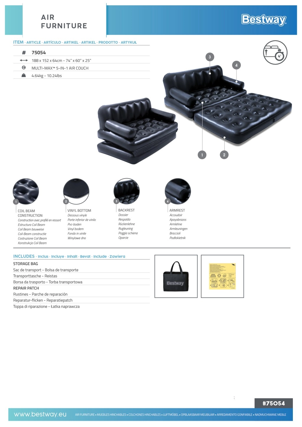 Le canapé gonflable BESTWAY 5 en 1 est la solution idéale pour le salon, la chambre d’amis ou un logement étudiant. Grâce à sa conception modulaire astucieuse, il se transforme en un clin d’œil d’un canapé deux places confortable en chaise longue ou en lit double complet. La surface au toucher velours avec compartiments accroît le confort en position assise comme allongée.