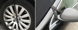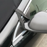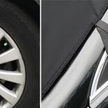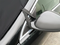Des sangles élastiques avec crochets se fixent aux rétroviseurs et aux roues, les bords sont sécurisés par les portes. La housse adhère au verre et résiste au vent.