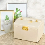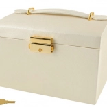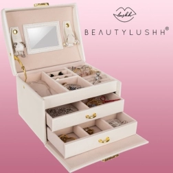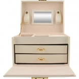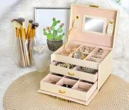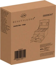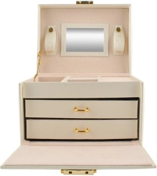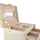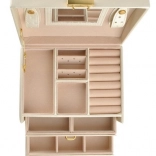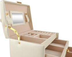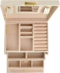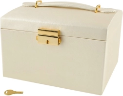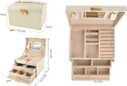 Élégante boîte à bijoux de couleur beige avec finition satinée, offrant jusqu’à 20 compartiments, 2 tiroirs et des rouleaux pour bagues. À l’intérieur du couvercle se trouvent un miroir et des bandes avec fermetures pour colliers et bracelets. Grâce au verrouillage à clé, vos bijoux sont en sécurité, tandis que le rembourrage doux protège contre les rayures. Les détails dorés soulignent une élégance intemporelle et la boîte convient aussi bien à la maison qu’en voyage.