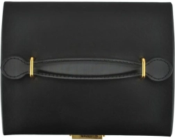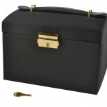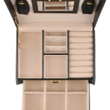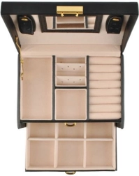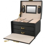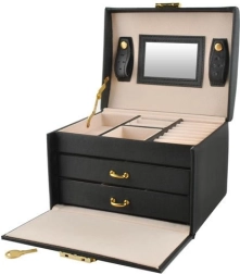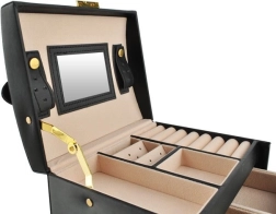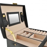 Le cuir PU noir avec des accents dorés et le miroir pratique intégré au couvercle allient style et fonctionnalité pour l’entretien quotidien de vos bijoux.