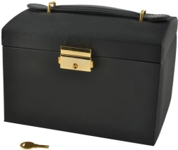 La doublure intérieure en matière douce protège délicatement la surface des bijoux pour éviter les rayures. Grâce à sa poignée pratique, la boîte est facile à transporter et, avec ses dimensions compactes, elle trouve sa place sur une coiffeuse comme dans un tiroir. La couleur noire intemporelle et les accents dorés soulignent le caractère élégant de l’intérieur.
