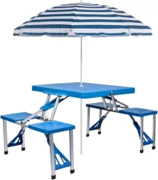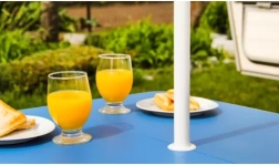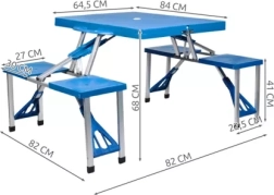 Le cadre robuste en aluminium et acier et les surfaces en PP résistant supportent un usage quotidien. La table est équipée d’un trou pour parasol (Ø 3,5 cm), pour profiter de l’ombre même par forte chaleur. Grâce à son faible poids et à son format plat une fois plié, l’ensemble se range facilement dans le camping-car, le véhicule aménagé ou le coffre de la voiture.