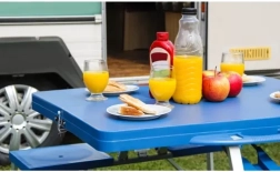 Profitez d’un repas confortable en plein air partout – près du camping-car, au jardin ou sur la plage. Cet ensemble pliant offre 4 véritables places assises et une table solide qui, une fois pliée, se transforme en valise compacte avec poignée. Grâce à sa conception ingénieuse, il se déplie et se replie en un clin d’œil, et les sécurités empêchent toute ouverture involontaire pendant le transport.
