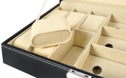 Des compartiments séparés, aux parois rehaussées, avec coussins amovibles, offrent un maintien stable pour différents types de montres et de lunettes et évitent tout contact entre eux.