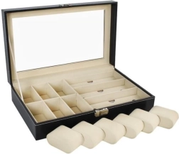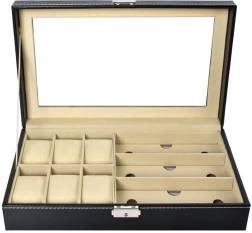 Cet organiseur noir élégant, avec surpiqûres blanches, allie allure représentative et praticité. Son couvercle vitré permet une présentation claire du contenu, tandis que des compartiments séparés avec doublure douce protègent montres, lunettes et autres bijoux des rayures et des contacts indésirables.