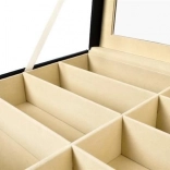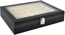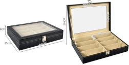Cette boîte à lunettes de qualité de la marque SOULIMA allie design élégant et organisation pratique. Le cuir écologique noir avec surpiqûres blanches offre une allure représentative, tandis que l’insert intérieur clair met en évidence chaque paire. Le couvercle en verre permet un aperçu rapide et une présentation décorative.