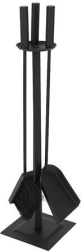 Le tisonnier, la pelle, la brosse et le support couvrent toutes les opérations du foyer, du brassage du combustible au nettoyage minutieux des cendres.