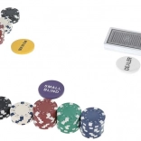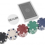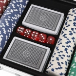 Sont également inclus des jetons fonctionnels DEALER, SMALL BLIND et BIG BLIND pour une organisation claire du jeu, 2× 54 cartes pour une rotation fluide des jeux et 5 dés pour d’autres divertissements de table. Le set est idéal pour les salles de jeu à domicile, les fêtes et les tournois entre amis.