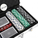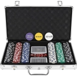 Set de poker complet pour tournois à domicile et soirées conviviales : 300 jetons professionnels avec noyau métallique, 2 jeux de cartes, 5 dés, jetons DEALER/SMALL BLIND/BIG BLIND et mallettes en aluminium robustes avec intérieur matelassé pour un transport sécurisé.