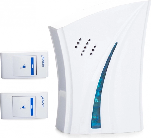 Sonnette sans fil, idéale pour un usage domestique. Comprend deux télécommandes et une unité de sonnerie avec une portée allant jusqu'à 150 mètres.