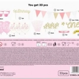 Bannière « One » (1 pc), guirlande en papier (1 pc), décors pour cupcakes (6 pcs), caissettes pour cupcakes rose clair (6 pcs), cake topper (1 pc), pailles (10 pcs), ballons mix de motifs (6 pcs), serpentins dorés (1 pc), ruban satiné rose clair 6 mm (1 pc)