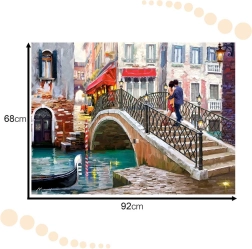 Le puzzle représente une illustration artistique d’un pont romantique à Venise avec un couple sur le pont. Ce motif apporte charme et mystère à l’image.
