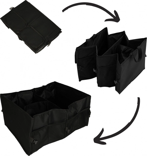 L’organiseur se déplie facilement pour une capacité maximale et se replie tout aussi rapidement à plat pour économiser de l’espace dans le coffre.