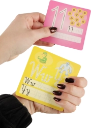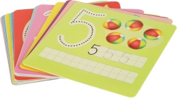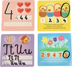 Des cartes colorées guident les enfants pas à pas pour reconnaître et écrire les chiffres 1–12 ainsi que les lettres majuscules et minuscules.