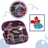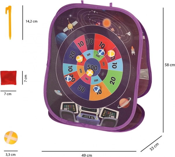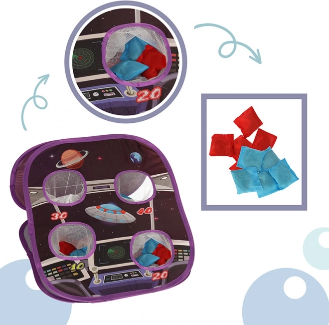 Ce jouet double-face à motif spatial apporte excitation et amusement aux enfants, à la maison comme au jardin. Deux types de cibles sont disponibles : un côté du panneau circulaire lumineux retient les surfaces adhérentes des balles souples à velcro, tandis que l’autre côté demande aux enfants de viser des ouvertures avec un sachet.