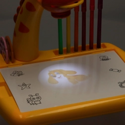 Ce mignon projecteur de table en forme de girafe rend chaque activité créative plus amusante. Après avoir inséré l’un des trois disques à images et allumé la projection, le motif apparaît sur la surface pour être facilement décalqué. Grâce à la surface effaçable, les enfants peuvent recommencer à l’infini – sans gaspiller de papier.