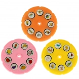 Trois disques colorés offrent au total 24 motifs (animaux, fruits, moyens de transport, etc.). Il suffit de tourner pour passer au motif suivant.
