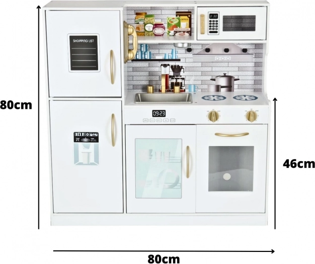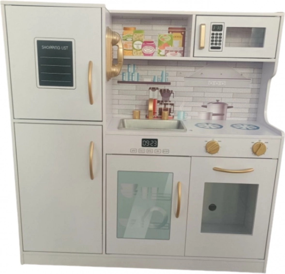 La cuisine comprend un réfrigérateur avec congélateur, un lave-vaisselle, un micro-ondes, une plaque de cuisson et un four, ce qui la rend réaliste et interactive. Un téléphone est même fixé sur le réfrigérateur pour appeler et demander des recettes familiales. Son design blanc avec des éléments dorés s’intègre parfaitement dans toute chambre d’enfant.