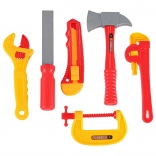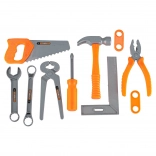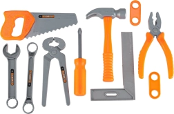 Marteau, scie, pince, clés, tournevis, éléments de construction ainsi que vis et écrous – tout pour visser, couper et assembler en toute sécurité.