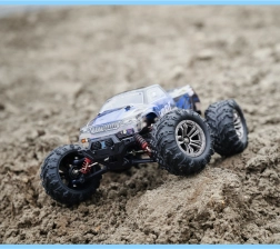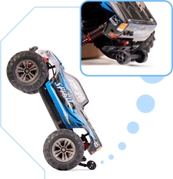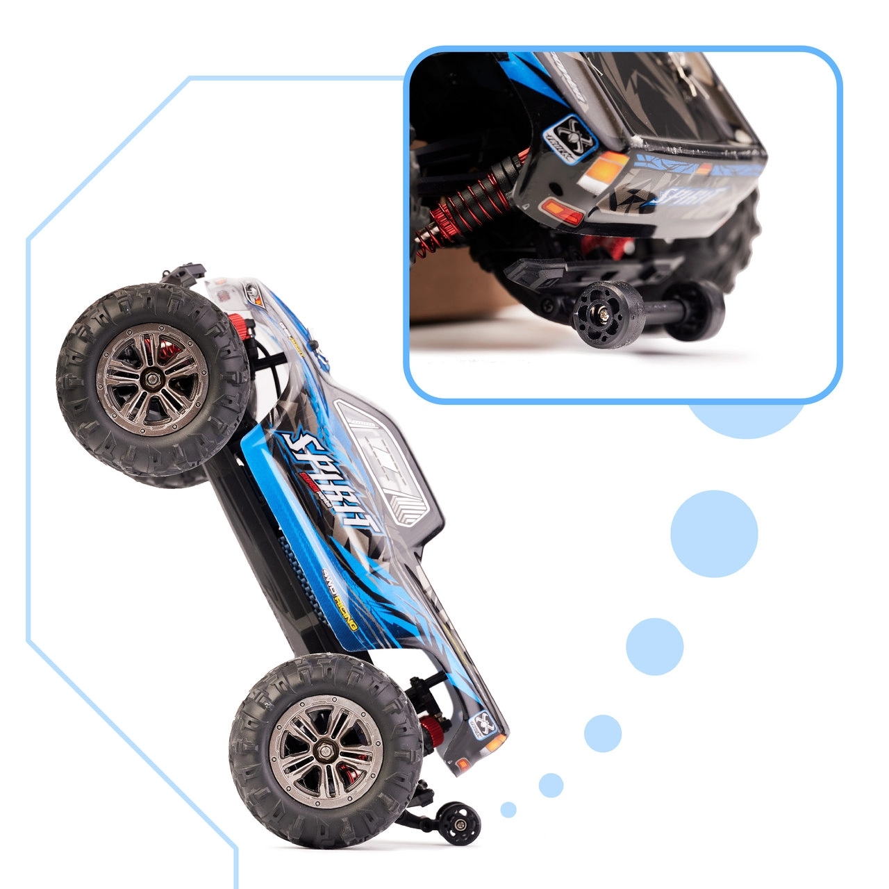 Les grands pneus AT et la suspension efficace assurent une excellente traction sur diverses surfaces — du salon au jardin. La radiocommande pistolet ergonomique avec gestion progressive des gaz et de la direction vous donne un contrôle précis en toute situation. Grâce à sa construction robuste, le modèle ne craint ni les chocs ni les chutes.