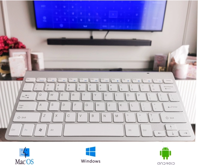 Il suffit de brancher le récepteur USB inclus pour commencer à taper – sans installer de pilotes et en quelques secondes. Grâce à la technologie 2,4 GHz stable, vous bénéficiez d’une portée jusqu’à 10 mètres depuis le récepteur, ce qui rend le clavier idéal pour contrôler une SMART TV, regarder des films ou travailler sur un ordinateur portable.