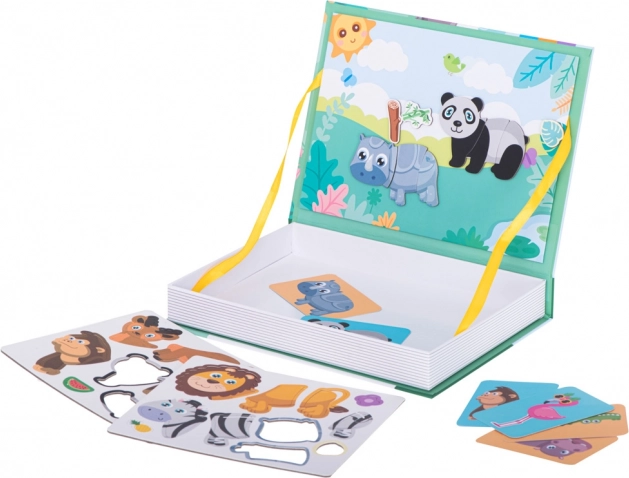 En quelques gestes, vous pouvez ouvrir le livre et commencer à créer des scènes avec des animaux de safari, tels que le lion, l’éléphant, le zèbre et bien d’autres. Lorsque l’enfant n’est pas sûr de la forme d’un animal, il peut utiliser les cartes colorées avec des modèles préimprimés.