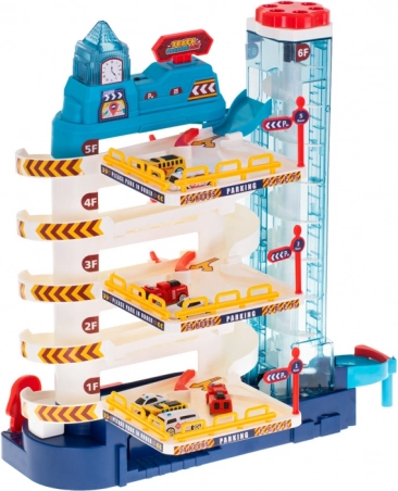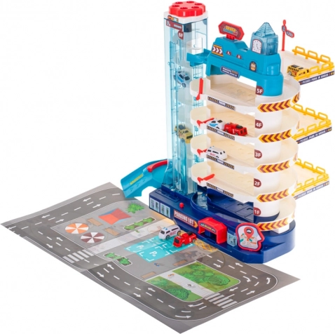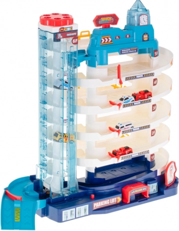 Grand parking à plusieurs étages pour enfants offrant jusqu’à 5 niveaux de stationnement, ascenseur électrique et manuel, effets lumineux et sonores et en plus 8 petites voitures en métal/plastique ainsi qu’un tapis de jeu représentant une ville. Un superbe jouet pour développer l’imagination, la motricité fine et la logique.