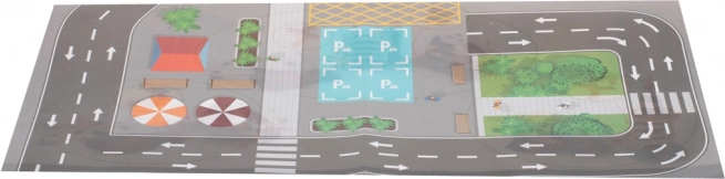 Un tapis avec impression de rues est inclus, afin d’agrandir l’aire de jeu et de faciliter la construction d’une ville autour du parking.