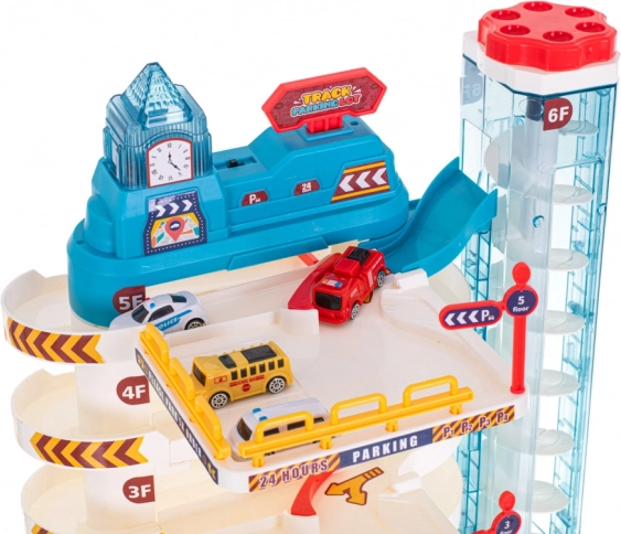 Ce garage réaliste transforme la chambre en ville animée. Grâce à l’ascenseur automatique, vous montez les petites voitures jusqu’aux étages supérieurs, puis elles dévalent les rampes en spirale. Les lumières clignotantes et la mélodie joyeuse de la tour avec horloge créent une belle ambiance – le son peut être activé et désactivé séparément.