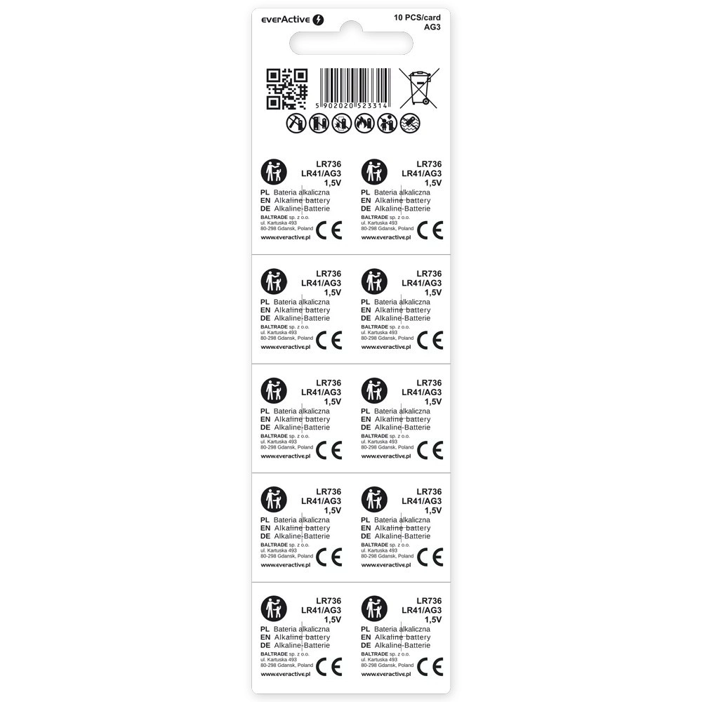 Les piles bouton everActive LR41 offrent une tension stable de 1,5 V pour une large gamme de petits appareils électroniques. Idéales pour les jouets, calculatrices, montres, décorations LED, appareils de mesure et dispositifs médicaux. Emballage pratique de 10 pièces en blister et compatibilité avec les désignations LR736/AG3 pour un remplacement facile.