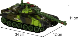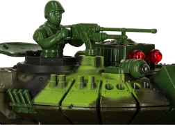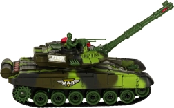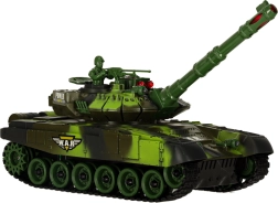 Le modèle offre de nombreux effets: phares LED avant, éclairage spectaculaire de la tourelle et sons authentiques du moteur, du tir de canon et de la mitrailleuse. Grâce aux chenilles souples en caoutchouc, il s’adapte à différents terrains et garde une excellente tenue de cap. La trappe ouvrante de la tourelle permet d’installer le tankiste fourni avec mitrailleuse. L’alimentation est assurée par une batterie rechargeable pour un usage économique et pratique.