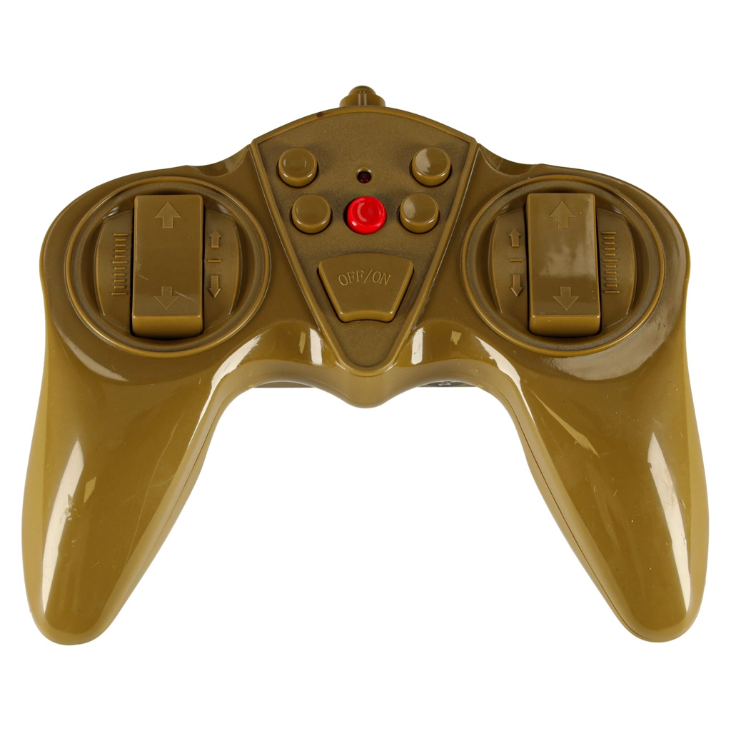 - Char RC, radiocommande, batterie, chargeur USB, figurine de tankiste avec mitrailleuse