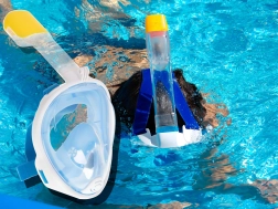 La partie supérieure du tuba est dotée d’un mécanisme dry-top qui limite l’entrée d’eau par le haut. Le masque s’ajuste facilement grâce aux sangles réglables et la jupe souple se pose agréablement sur le visage. Sont inclus dans l’emballage des bouchons d’oreilles et un support pour caméra d’action GOPRO afin de capturer vos aventures sous-marines.